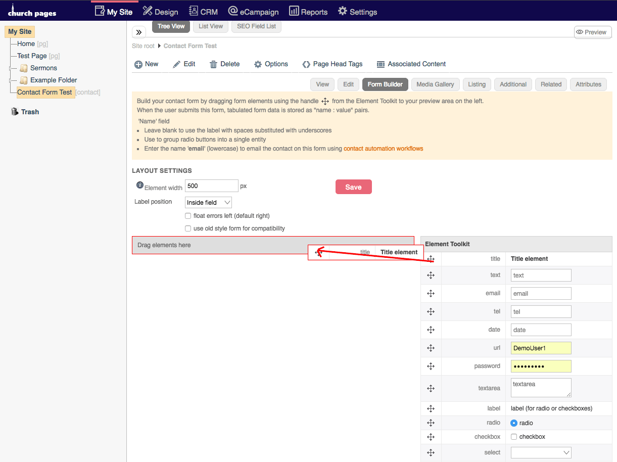 14. Once you have all of your elements correctly added to your form, check you have both an 'email' element and a 'submit' element so your site visitor can submit your form. Then Click Save.