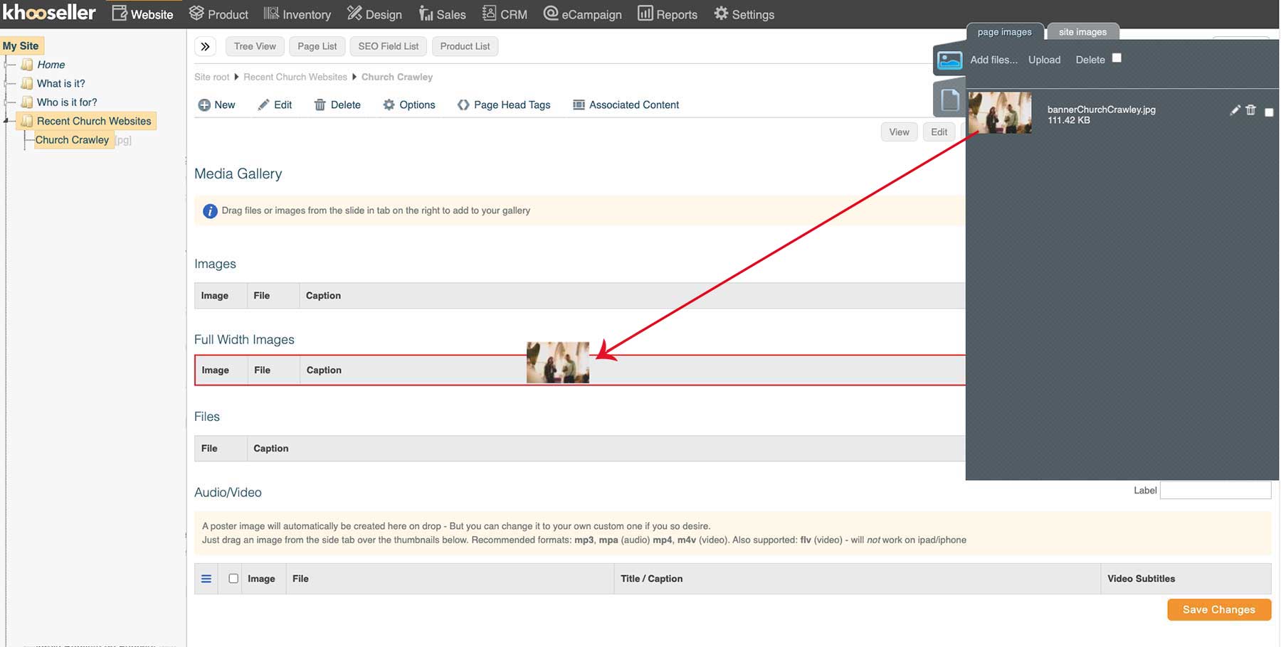 Adding images, files or audio files to your pages and folders in your site is done using the 'Media Gallery'. This is where you can change your banner images, upload pdfs or other documents, or upload sermon talks to your website. Also make sure that your image isn't more than 1MB so as not to slow down your site unnecessarily. There is a tool to compress images here and how to use it can be seen here.