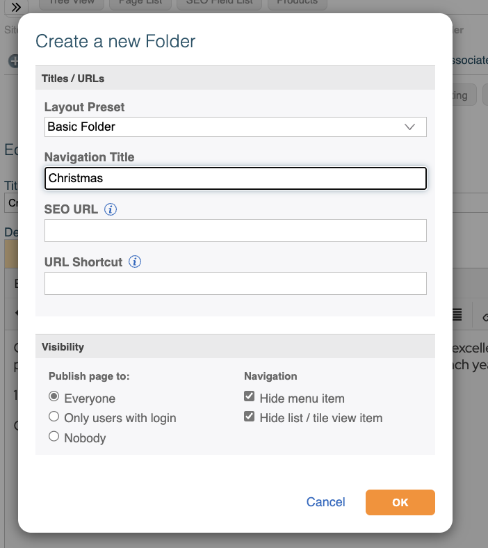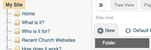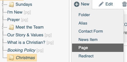 3. Click on the folder Christmas in the left hand nav so that it goes orange, now click New > Page