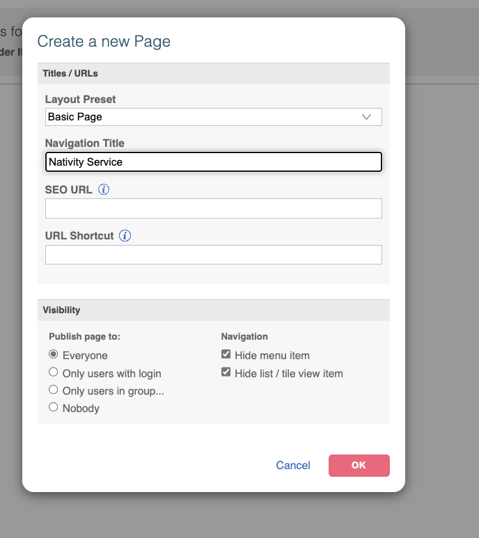 Then complete the pop up Dialogue box with a title, we've used Nativity Service, and then click OK.