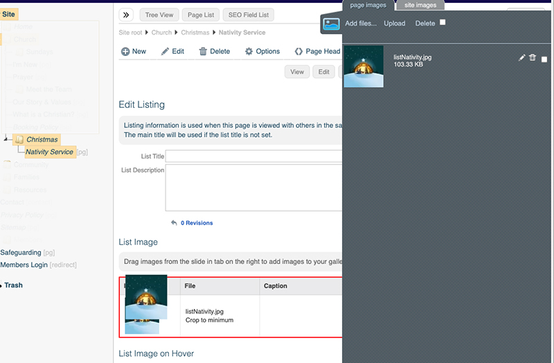 6. Once the Listing page appears click on the Page Images fly-out and click Add Files and find a responsive nativity image to use as your Listing image. Please do not have any writing on it, and make sure that it works well on the mobile.